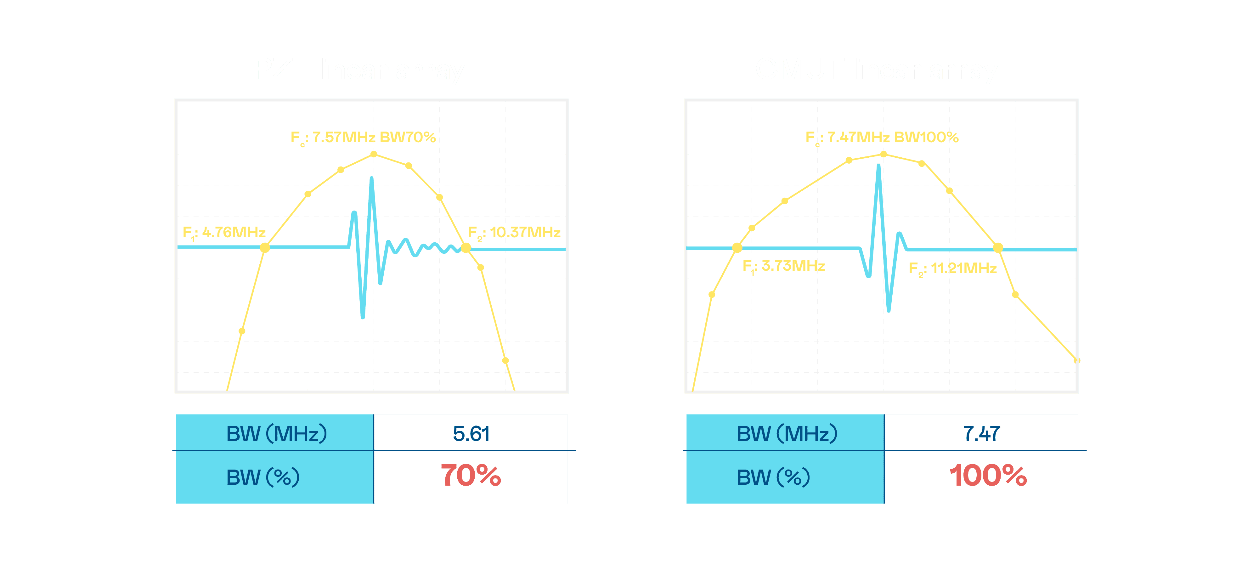 超音波影像的解析度高低,,,首先取决于探头能发出的讯号频宽。。。彩霸王 CMUT 可提供高清晰的超音波讯号,,,,提供高频宽、、、高灵敏度、、影像纹理细节更高的超音波影像,,,,协助医护人员缩短影像判读时间及利用精准的医疗影像进行诊断。。